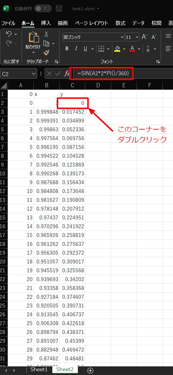 同様に、C2セルには、Y座標を表す以下の式を入れます。
