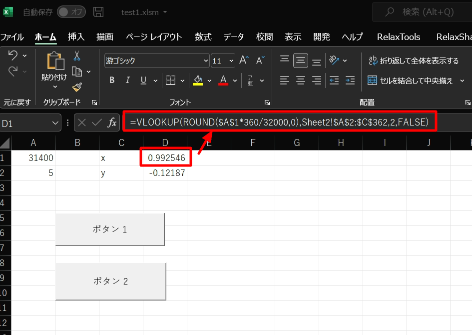 =VLOOKUP(ROUND($A$1*360/32000,0),Sheet2!$A$2:$C$362,2,FALSE)D2にも同様に、以下の計算式を入力します。