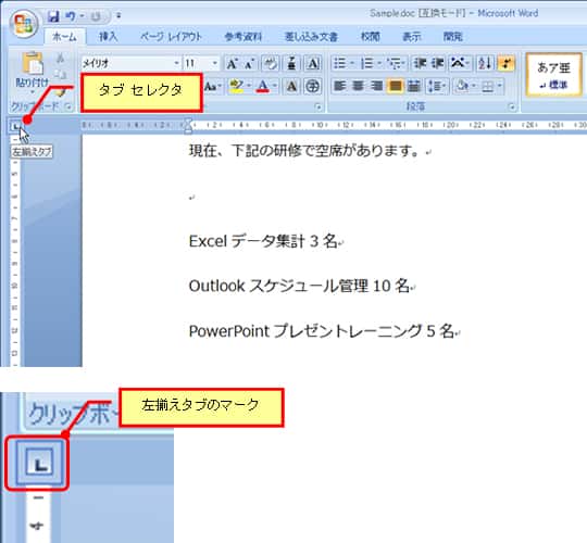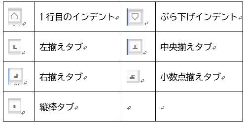 1.水平ルーラーの左端(垂直ルーラーの上)にあるタブセレクタには、既定では[左揃えタブ]が選択されてマークが表示されていますが、違う種類が選択されている場合は、[左揃えタブ]のマークが表示されるまで数回クリックします。