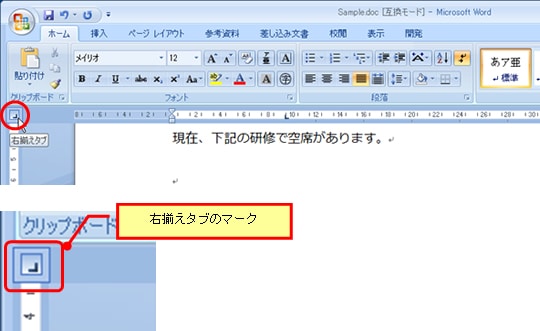 2.Step4で設定した右揃えタブの位置に、段落の末尾が移動します。カーソルの右側にある文字が、右方向へずれます。