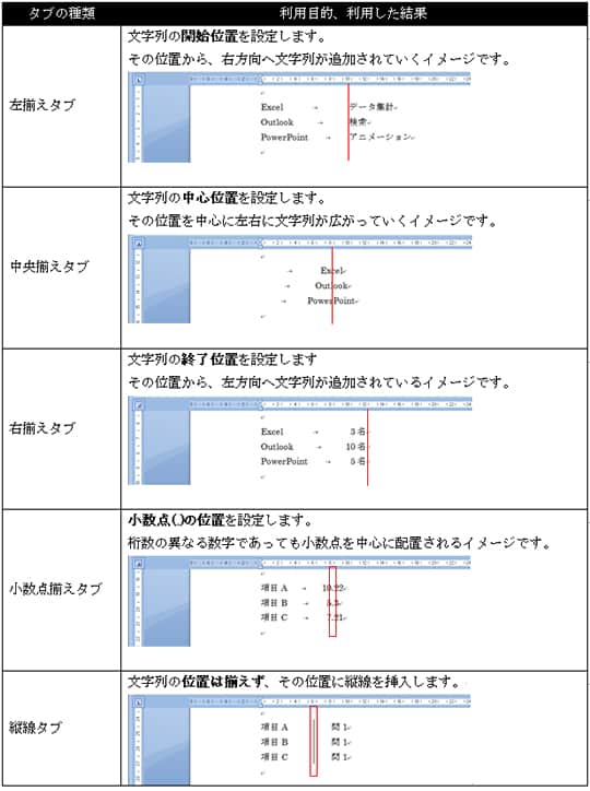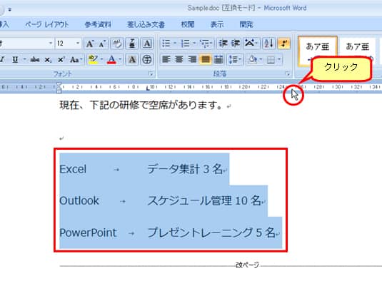 3.同じように左揃えタブの位置が設定されている他の段落(OutlookとPowerPointで始まる段落)でも、タブを挿入する位置をクリックしてカーソルを表示し、[Tab]キーを押してタブを挿入します。