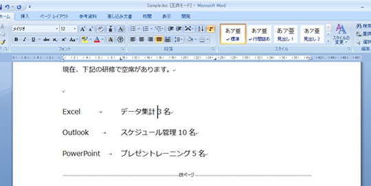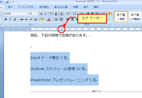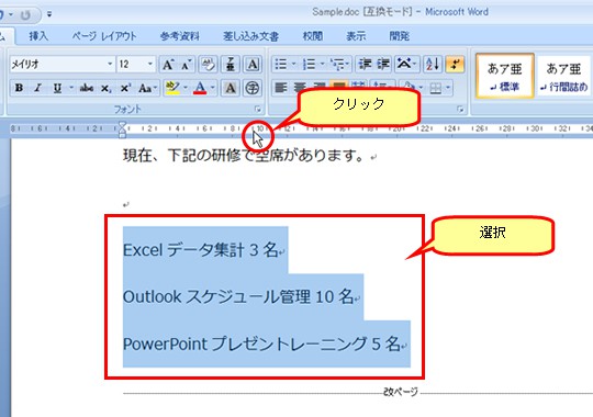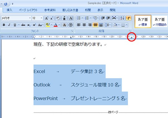 2.タブの位置を設定する段落を選択し、水平ルーラーで左揃えタブの位置としたい場所をクリックします。水平ルーラー上のクリックする位置は、各段落の2つ目の単語(データ集計、スケジュール管理、プレゼントレーニング)の開始位置としたいあたりをクリックします。あとから変えられるので、「だいたいこのあたり」というところでクリックしてよいです。