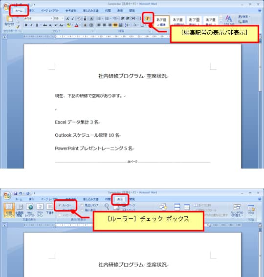 画面の変化や設定位置がわかりやすいように画面上に編集記号が表示されるように設定し、タブ設定に利用するルーラーを画面に表示してから進めます。リボンの[ホーム]タブの[編集記号の表示/非表示]と、[表示]タブの[ルーラー]チェックボックスをオンにしてください。