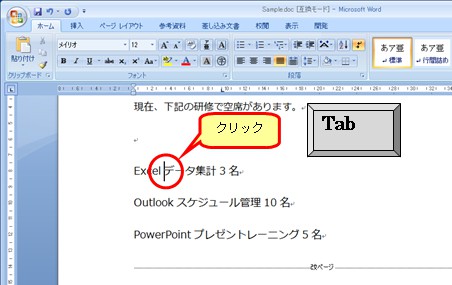 1.タブを挿入する場所(データ集計と3名の間)をクリックしてカーソルを表示し、キーボードの[Tab]キーを1回押します。