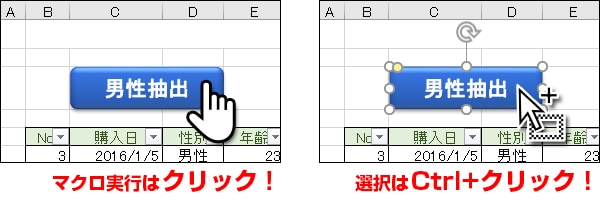 ボタンを移動したい場合など、マクロ登録後にボタンを「選択」したい場合は、Ctrlキーを押しながらクリックしましょう。