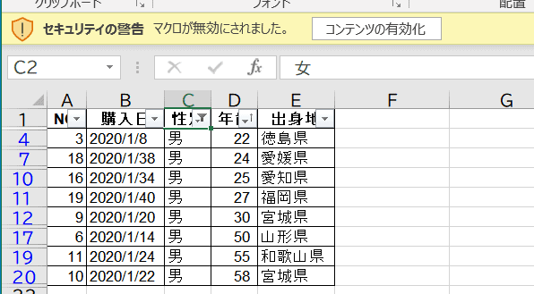 ちなみに、「マクロ有効ブック」で保存したファイルを開くと、下記のように「セキュリティの警告」バーが画面上部に表示されます。このバーの「コンテンツの有効化」をクリックすることで、ブックのマクロを有効化できます。