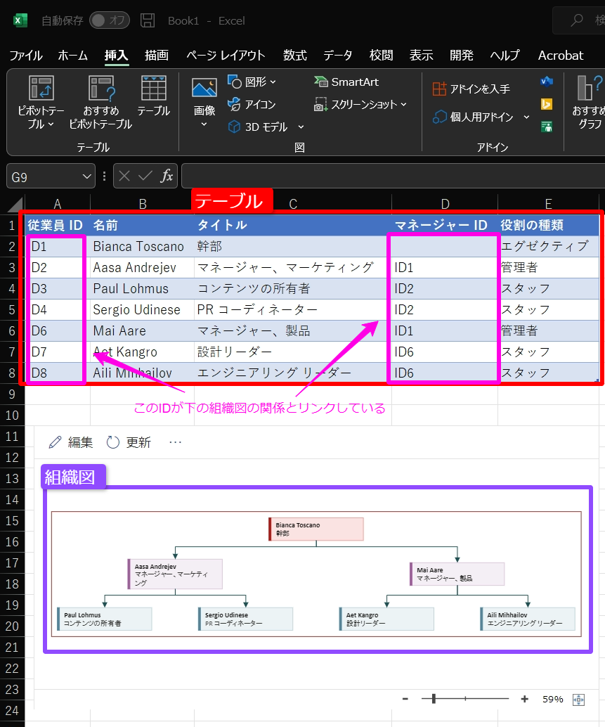 すると、下図のように、サンプルのテーブルと組織図の画像が生成されます。