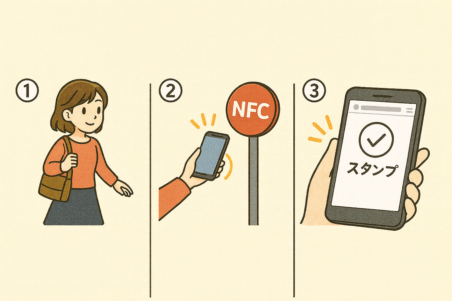 NFCデジタルスタンプラリーは、参加者が特別なアプリを起動したり、複雑な操作をしたりする必要がありません。参加者の体験は非常にシンプルです。