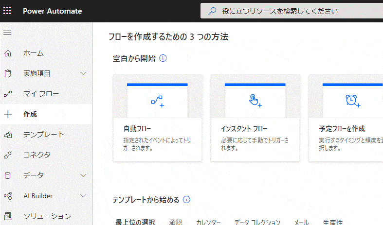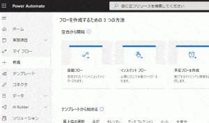 まず、「Power Automate」のホーム画面の左側のメニューの「+作成」をクリック