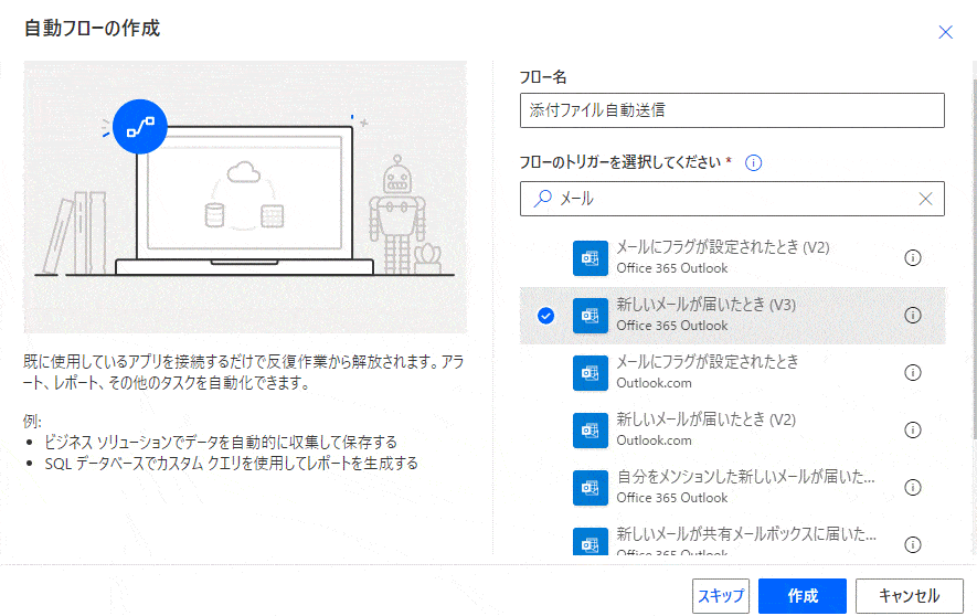 下図のように、「フロー名」を任意に設定して、「フローのトリガー」を「新しいメールが届いたとき」に設定して、「作成」ボタンをクリック