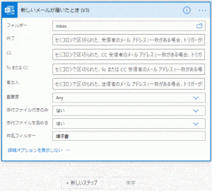 いろんな条件で次のステップのアクションを決められますが、今回は「添付ファイルあり」を「はい」、「添付ファイルを含める」を「はい」、「件名フィルター」を「請求書」としました。