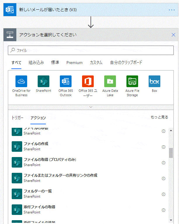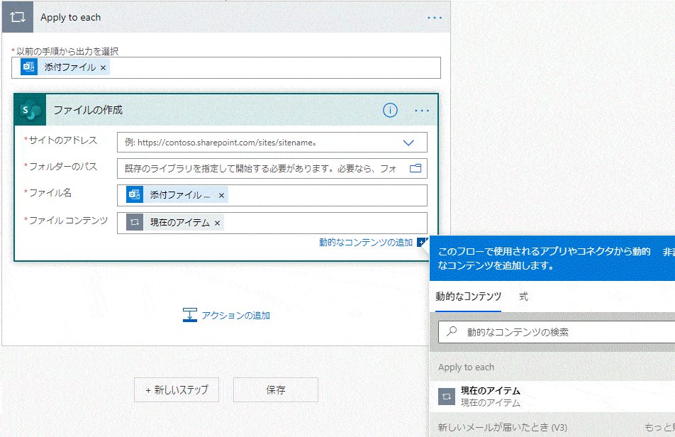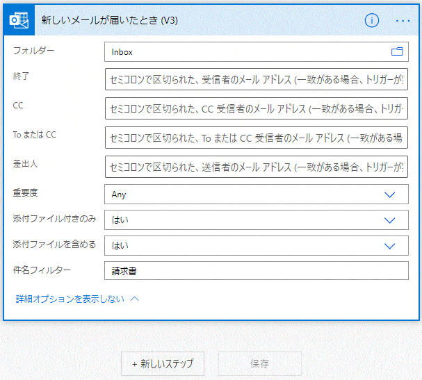 例題ですが、例えば、請求書が添付されたメールを受けたら、その添付ファイルを共有フォルダ(SharePoint)に保存しちゃいましょう。