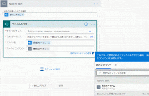 ここでは、詳細を記載しませんが、サイトのアドレスを指定し、保存したいフォルダーを指定、ファイル名の指定と、最後にファイルコンテンツの指定。ファイルコンテンツは上図のように、ボックス内をクリックすると右側に「現在のアイテム」とでるので、それをクリック。これは、メールのところで指定した添付ファイルのことを意味しています。
