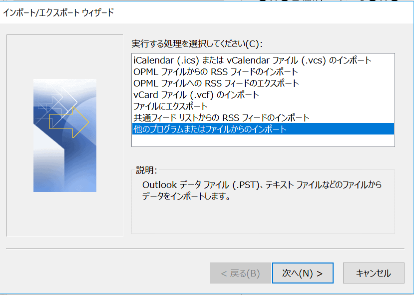 [インポート/エクスポート ウィザード]から、[他のプログラムまたはファイルからインポート]を選択して、[次へ]のボタンをクリックします。
