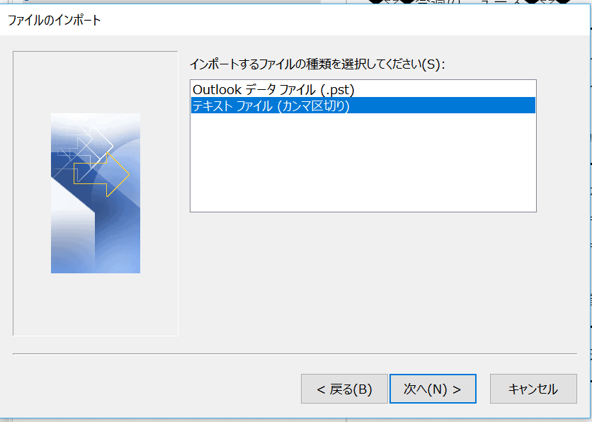 [ファイルのインポート]から、[テキストファイル(カンマ区切り)]を選択して、[次へ]のボタンをクリックします。