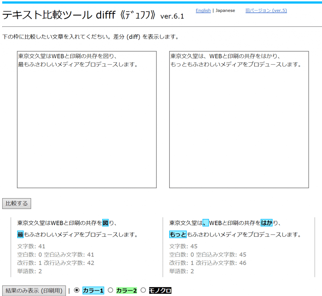 比較したいテキストを入れて「比較する」ボタンをクリックすると判定結果が表示されます。