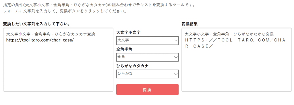 指定の条件(大文字小文字・全角半角・ひらがなカタカナ)の組み合わせでテキストを変換するツールです。