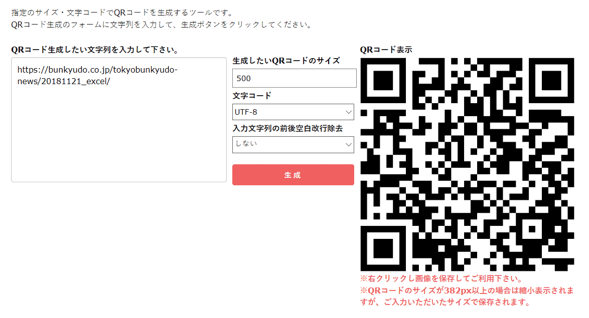 指定のサイズ・文字コードでQRコードを生成するツールです。