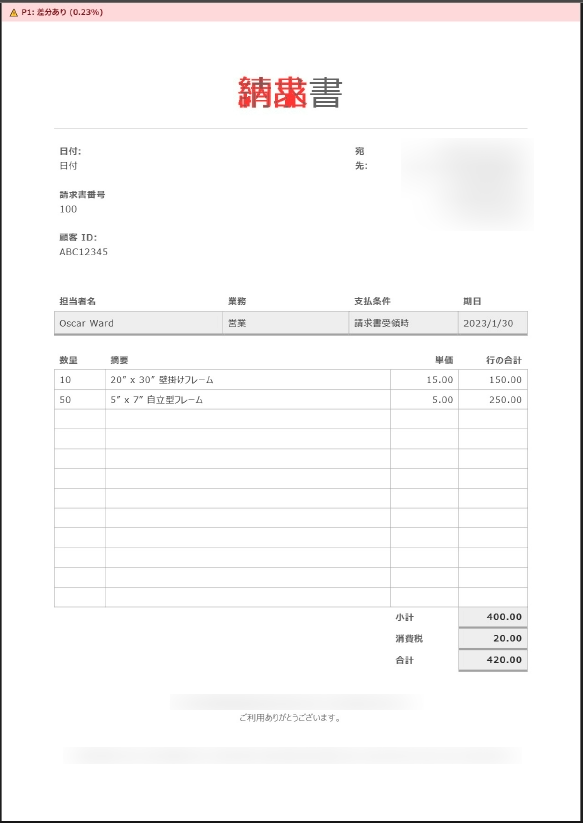 カラーの文書同士を比較すると、どこが変更点か目が泳いでしまいがちです。 そこで本ツールでは、元データをあえてグレースケール(モノクロ)化して表示する処理を入れました。その上で、差異があるピクセルだけを鮮烈な「赤」でハイライトします。