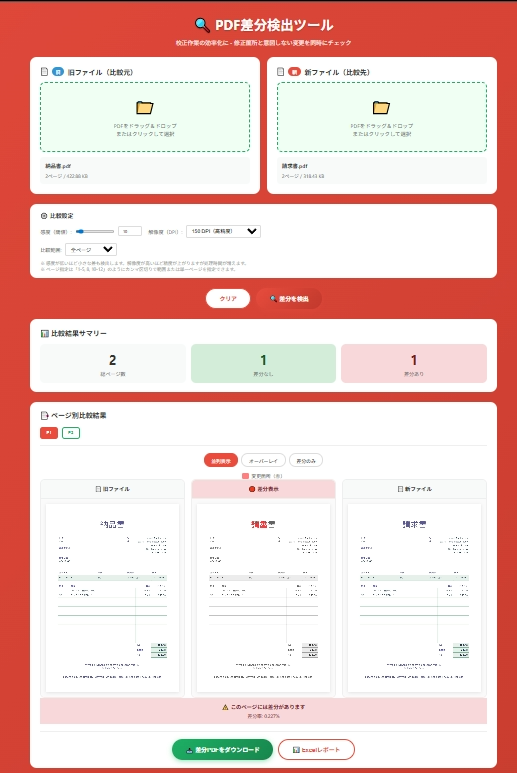 旧ファイルと新ファイルをそれぞれドラッグ&ドロップして、「差分を検出」ボタンをクリックするだけです。