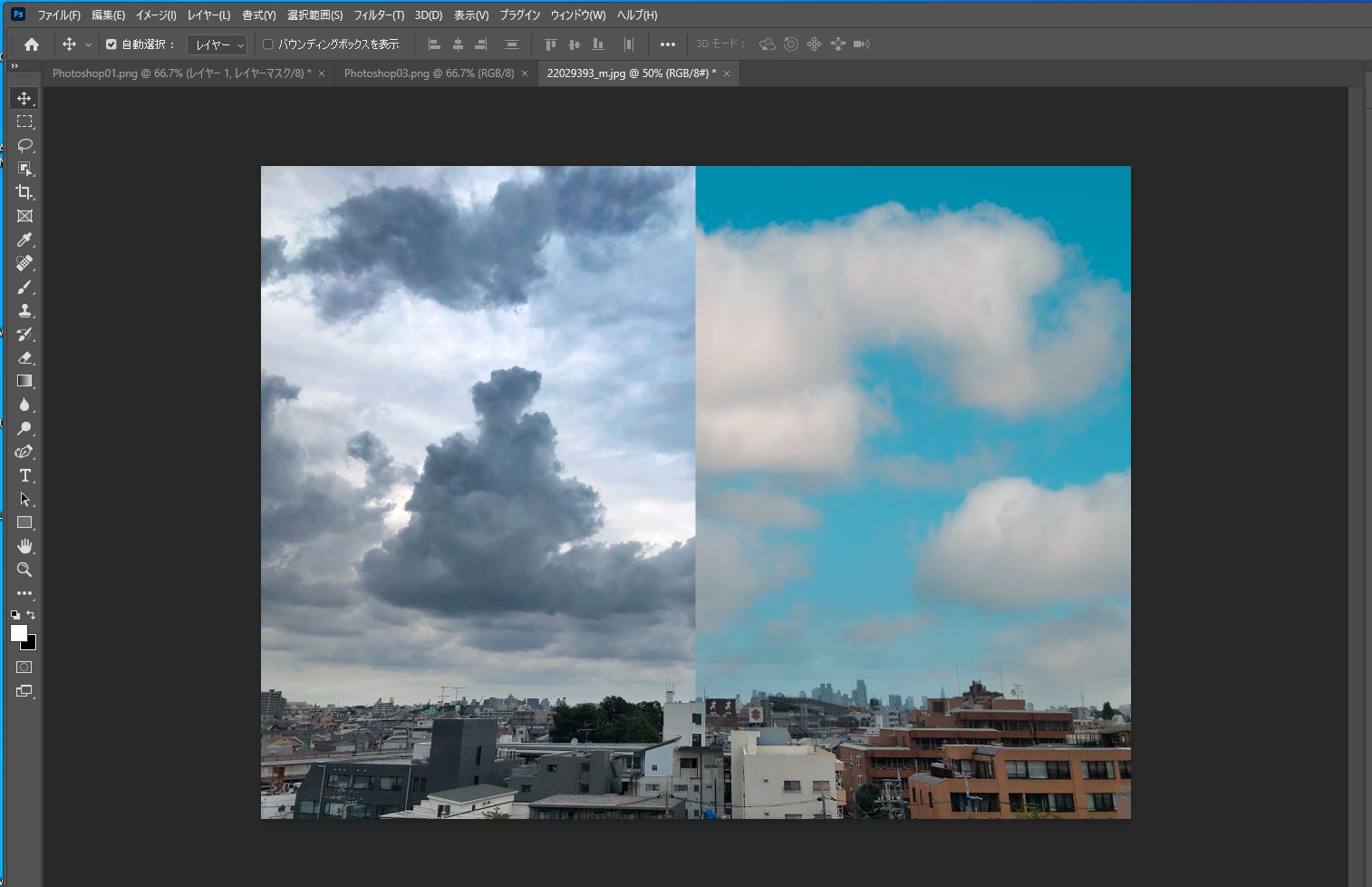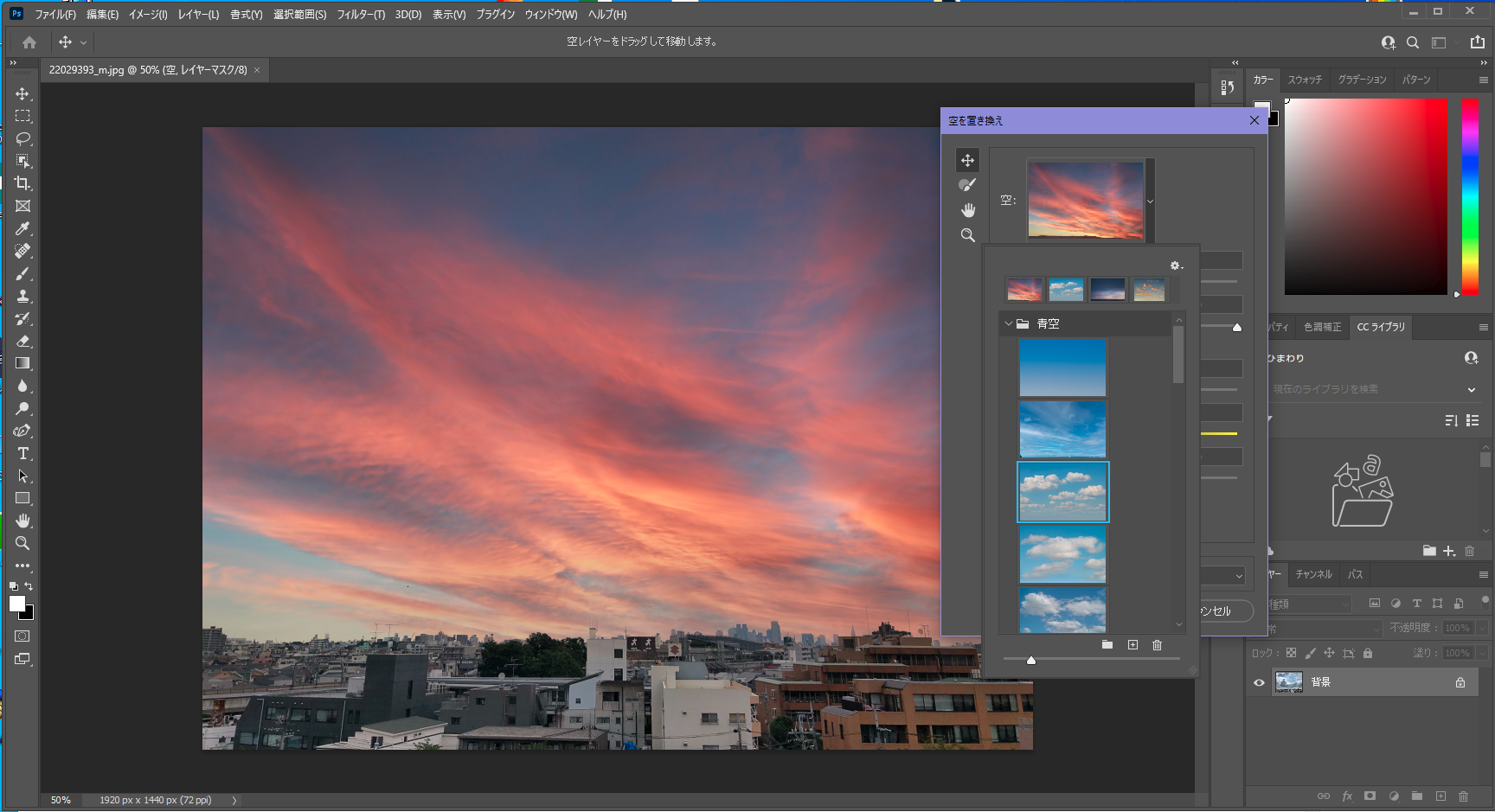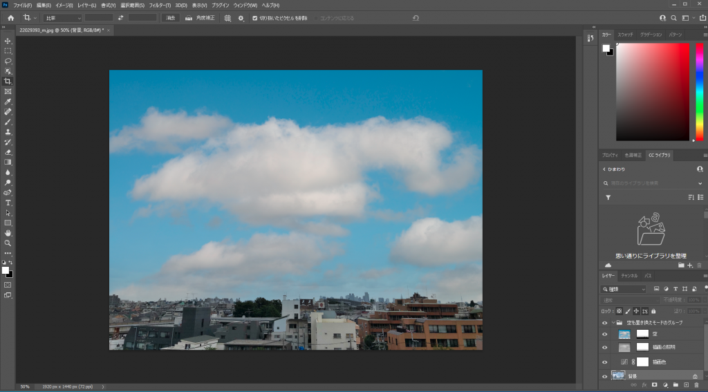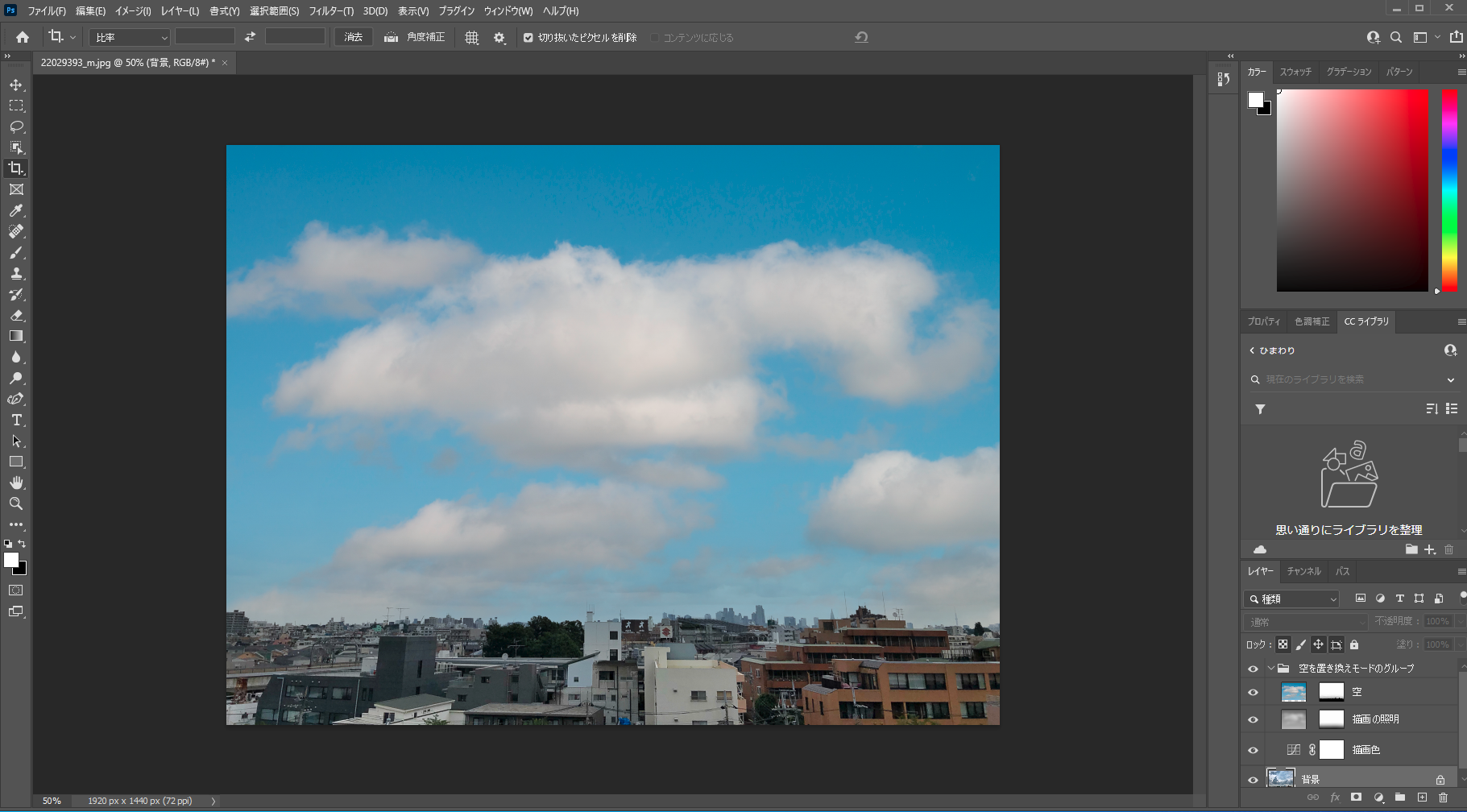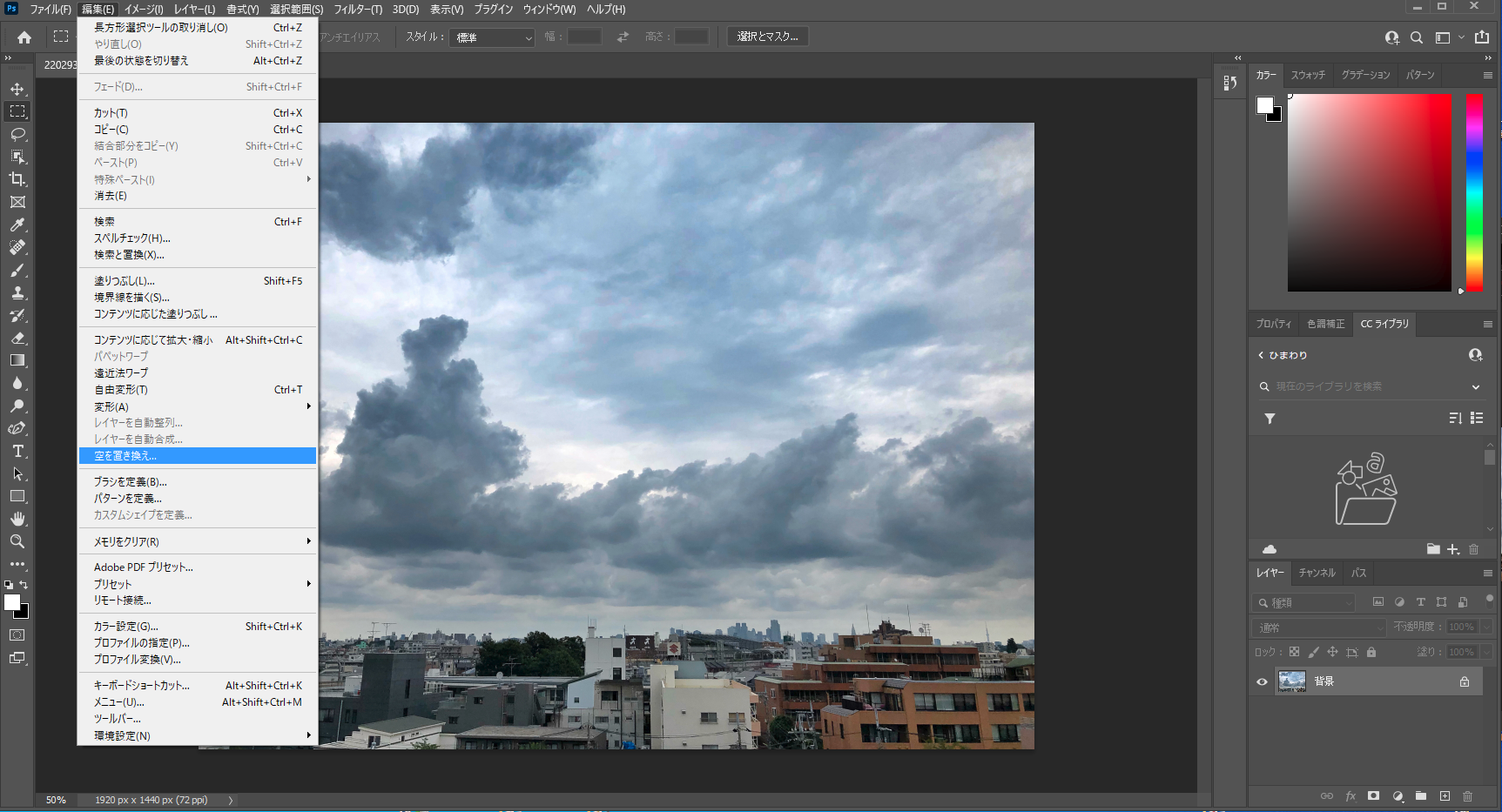 ホームデザイン 知らなかった!?【Adobe Photoshop】のAIで空模様を変える話 2025年12月2日 2021年8月18日 1 min 1,057 views BUNKYUDO 本日は【Adobe Photoshop】のAI機能の1つ”空の置き換え” をご紹介します。 動画の音声はVOICEVOXの『四国めたん』と『ずんだもん』によるものです。テキストはPremier Proの『音声テキスト変換』を使用しています。 STEPフォトショで画像を開きます メニュー[編集]から[空を置き換え]を選択します。 STEPさまざまな空模様 ちょっとエモい感じの夕暮れ STEP 爽やかな青空になりました レイヤーパレットを見ると、AIが抽出した空の部分にだけ「空を置き換えモードのグループ」が追加されています。 STEPBefore After 全く違う景色になっていますね BUNKYUDO 曇り空が、爽やかな青空になりました。AI機能「Adobe Sensei」が写真の中で「空」の部分を抽出して置き換えてくれているのです。感動しちゃいます!