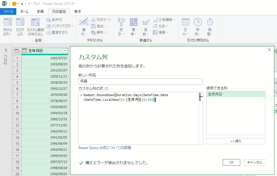 上図のように、「列の追加」タブ>「カスタム列」をクリックすると、ウィンドウが立ち上がるので、新しい列名に「年齢」と入力し、カスタム列の式にこちらの関数を入力します。