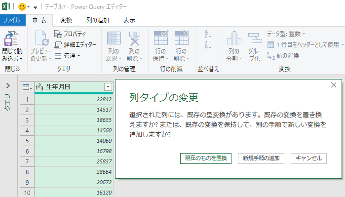 上図の右上にある「変換」リボンの「データ型:整数」をクリックして、「日付」を選択するとウィンドウが立ち上がりますので、「新規手順の追加」をクリック
