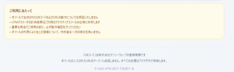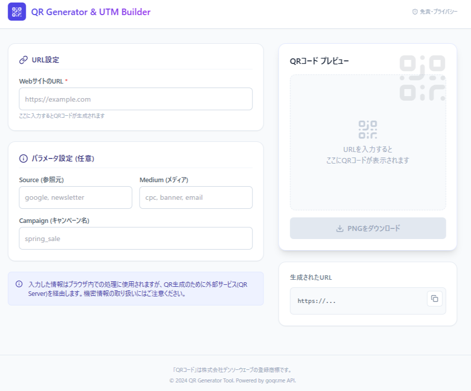 【ここが良い!】 とにかくデザインがシンプルで美しいです。 「URLを入れる」「パラメータを入れる」「QRが出る」という動線が一直線で、迷う要素が一切ありません。余計な装飾を削ぎ落としたUIは、まるで熟練のデザイナーが調整したかのよう。