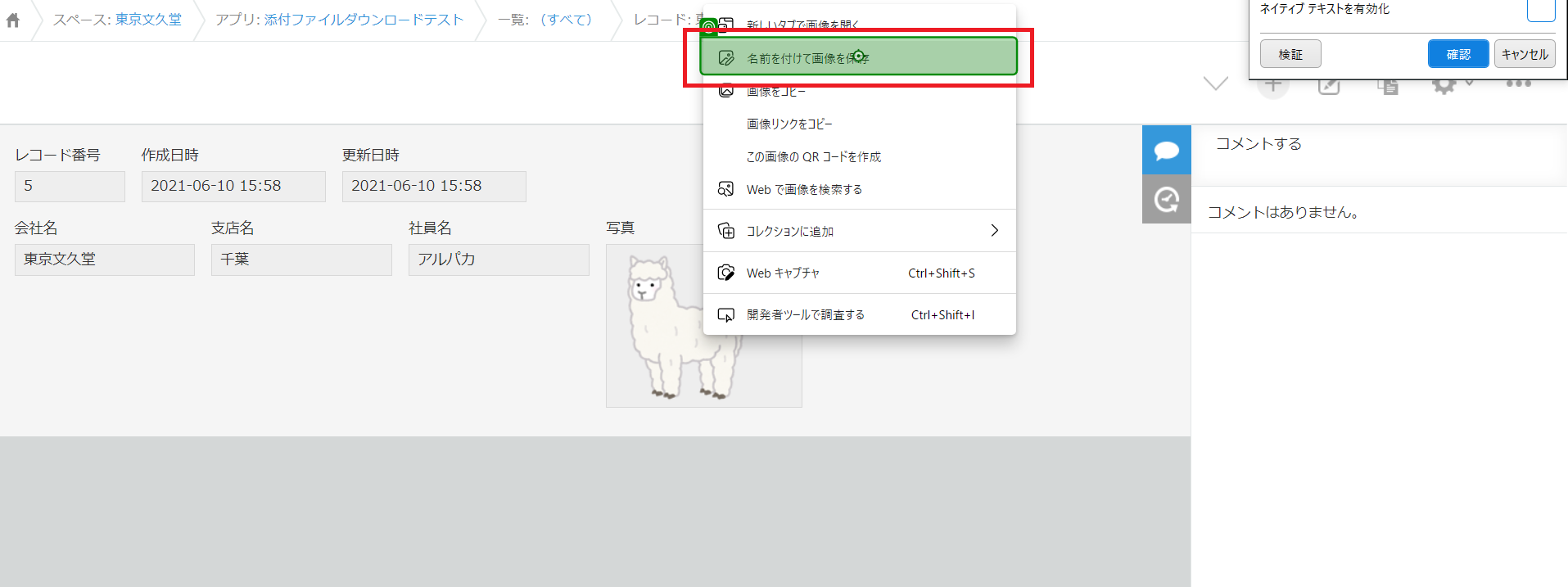 一括で写真データをダウンロードする機能があれば良いのですが、今回サンプルとして使用しているkintoneの標準機能では添付ファイルの一括ダウンロードができません。