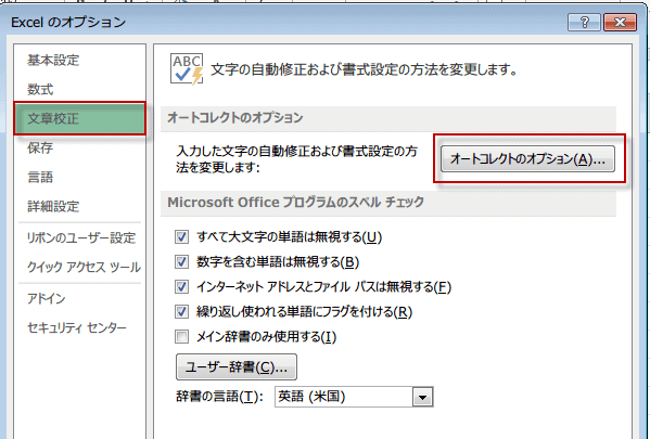 オプションをクリックして、オプションダイアログボックスを表示します。左側のメニューから文章構成を選択、オートコレクトのオプションボタンをクリックします。