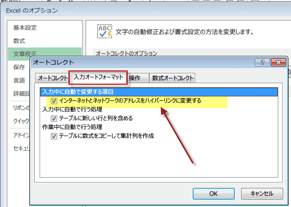 勝手にハイパーリンクが設定されるのは、この入力中に自動で変更する項目のインターネットとネットワークのアドレスをハイパーリンクに変更する、のチェックがデフォルトでONになっているからです。