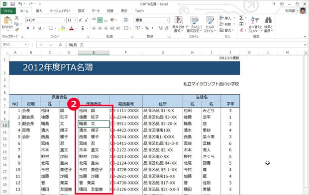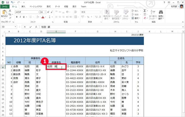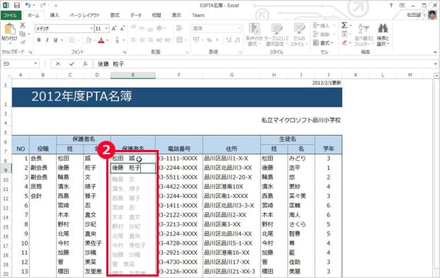 2 件目のセルを選択し、姓を入力し漢字に変換します。データが自動認識され、表の最終行まで氏名が表示されます。