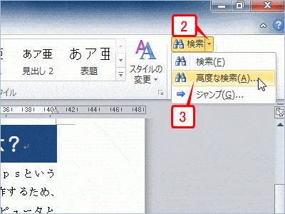 - [ホーム]タブの[編集]にある[検索]ボタンの[▼]をクリックします。