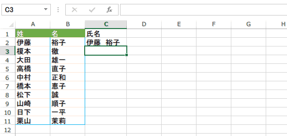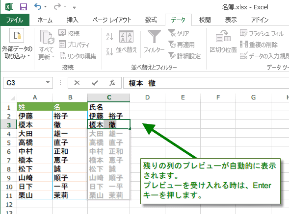 ホームOffice系ソフト 複数のセルのテキストを 1 つのセルに結合する 2025年12月1日 2017年7月5日 1 min 477 views 名簿の姓と名から氏名を結合させるように、複数のセルのテキストを 1 つのセルに結合することができます。 最初の結合されたテキストを入力します。 次の結合されたテキストを入力します。 結合されたテキストが入力された残りの列のプレビューが、自動的に表示されます。プレビューを受け入れる場合、Enter キーを押します。 この場合、フラッシュフィルボタンを押さなくてもフラッシュフィルが働いてしまいました。
