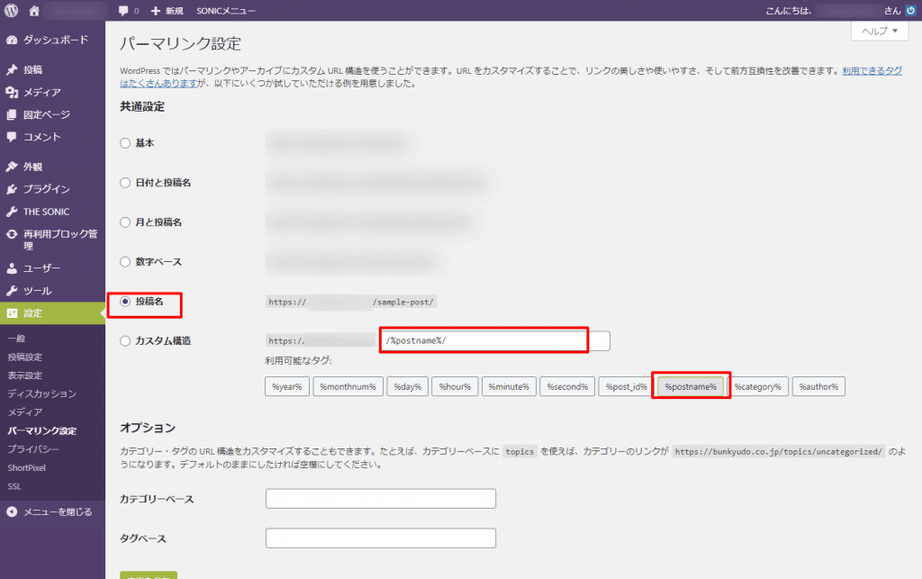 共通設定で「投稿名」を選択し、カスタム構造を「/%postname%」と入力します。