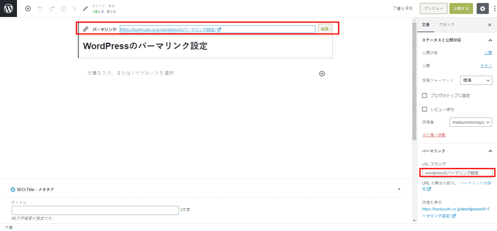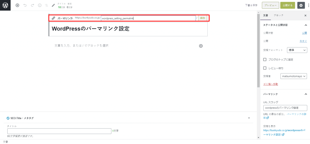 タイトルを入力すると、下記のようにタイトルがそのままパーマリンクになります。