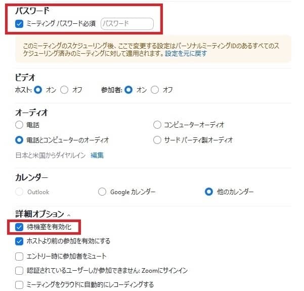 ・”ミーティングパスワード必須”と、”待機室を有効化”にチェックを入れる